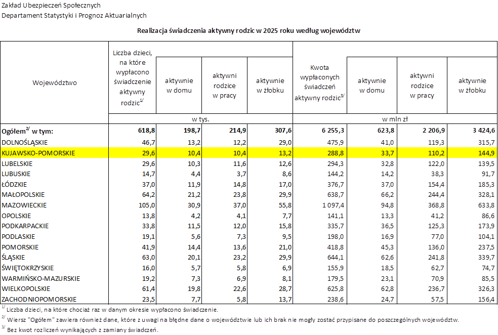 W 2025 roku ZUS wypłacił w ramach programu „Aktywny Rodzic” 6 mld 255 mln zł dla prawie 619 tys. dzieci w całej Polsce. W województwie kujawsko-pomorskim było to 288,8 mln zł dla 29,6 tys. dzieci.