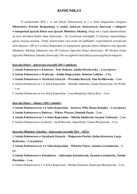 23 października 2025 r. w sali Szkoły Podstawowej nr 1 w Solcu Kujawskim rozegrano #Mistrzostwa Powiatu Bydgoskiego w tenisie stołowym drużynowym dziewcząt i chłopców w kategoriach Igrzysk Dzieci oraz Igrzysk Młodzieży Szkolnej.