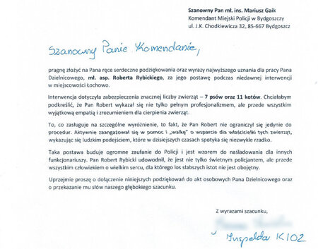 Serdeczne podziękowania oraz wyrazy najwyższego uznania za zaangażowanie i profesjonalne podejście do realizacji czynności służbowych, a także empatię i zrozumienie wykazane przez młodszego aspiranta Roberta Rybickiego trafiły na ręce Komendanta Miejskiego Policji w Bydgoszczy młodszego inspektora Mariusza Gaika.