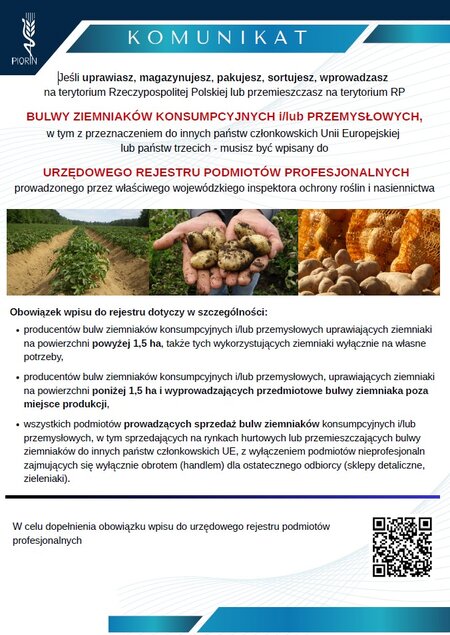 Jeśli uprawiasz, magazynujesz, pakujesz, sortujesz, wprowadzasz na terytorium Rzeczypospolitej Polskiej lub przemieszczasz na terytorium RP bulwy ziemniaków konsumpcyjnych i/lub przemysłowych, w tym z przeznaczeniem do innych państw członkowskich Unii Europejskiej lub państw trzecich - musisz być wpisany do Urzędowego Rejestru Podmiotów Profesjonalnych prowadzonego przez właściwego wojewódzkiego inspektora ochrony roślin i nasiennictwa.