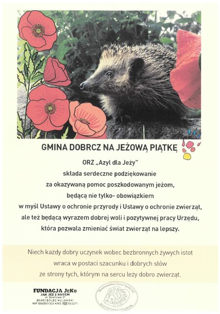 Gmina Dobrcz otrzymała podziękowanie od ORZ „Azyl dla Jeży" za współpracę i #okazywaną pomoc poszkodowanym jeżom.