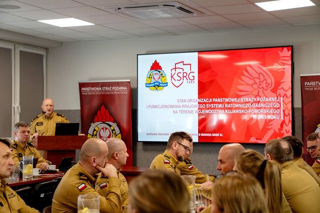 W Szkole Podoficerskiej PSP #w Bydgoszczy odbyła się narada roczna kadry kierowniczej Państwowej Straży Pożarnej województwa kujawsko-pomorskiego. Podczas spotkania podsumowano działalność komend powiatowych i miejskich oraz Szkoły Podoficerskiej w minionym roku.
