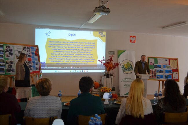 Podczas konferencji pani Agnieszka Gwizdała, koordynator projektu, zaprezentowała cele i rezultaty przedsięwzięcia, podkreślając, jak wielkie znaczenie mają tego typu inicjatywy w rozwoju młodych ludzi. O współpracy z włoską firmą Promimpresa opowiedziała pani Karolina Plotnicka, która pośredniczyła w organizacji praktyk.