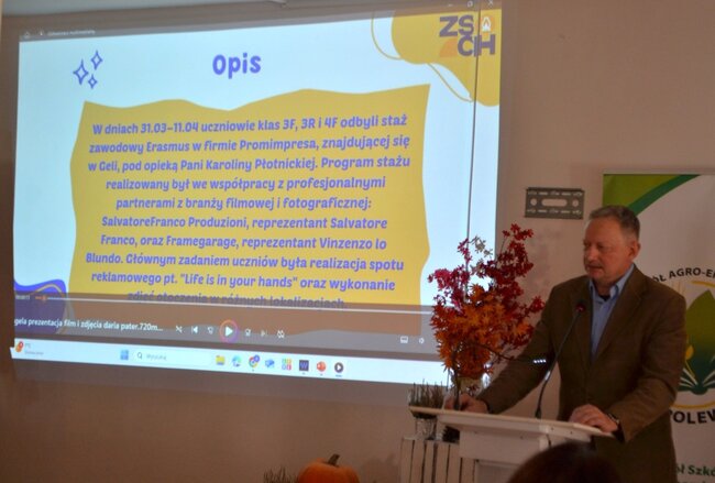 Spotkanie było podsumowaniem zagranicznych praktyk zawodowych uczniów, którzy mieli okazję zdobywać doświadczenie we włoskich firmach. Ich pobyt na Sycylii to nie tylko lekcja zawodu, ale także nauka samodzielności, współpracy i otwartości na nowe kultury – cech niezwykle cennych na dzisiejszym rynku pracy. Uroczystego otwarcia dokonał pan dyrektor Stanisław Buś, a spotkanie poprowadziły uczennice klasy II technikum A: Dominika Kaczmarek i Zofia Kaczmarek.