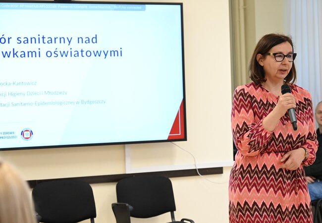 - Nadzór sanitarny w placówkach oświatowych – temat omówiła Justyna Przygocka-Kantowicz – Kierownik Sekcji Dzieci i Młodzieży. Przedstawiła obowiązki szkół w zakresie zapewnienia bezpiecznych i higienicznych warunków nauki, najczęstsze zalecenia pokontrolne oraz obszary wymagające stałego monitorowania.
